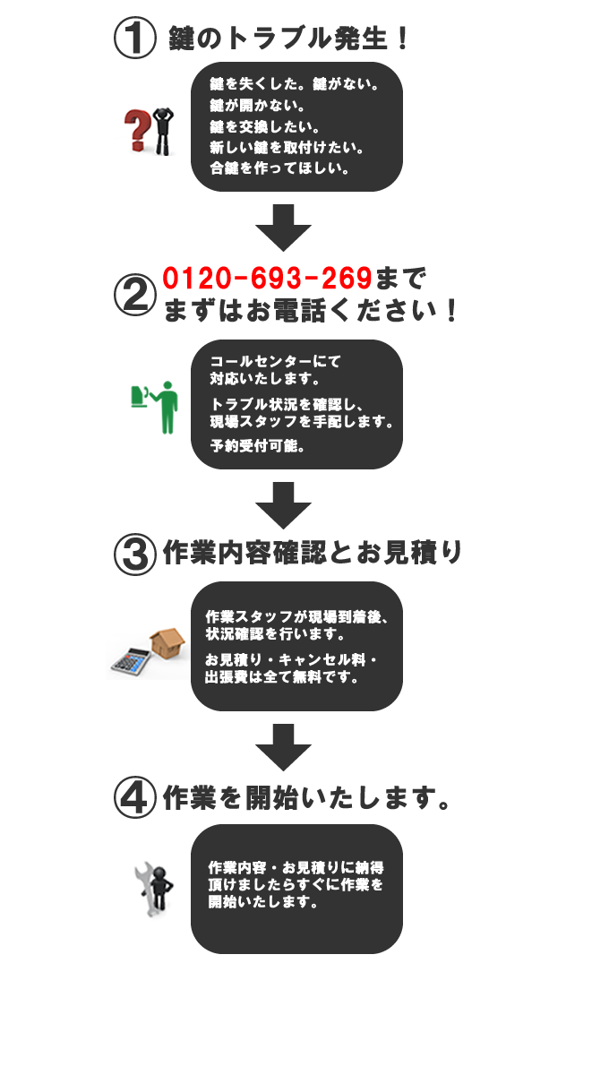 サービススタッフがカギのトラブル発生場所近くを巡回中の場合、最短20分で駆けつけることができることもあります。